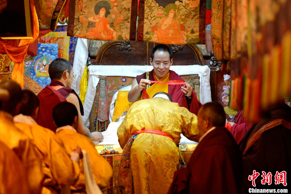 9月3日,班禅在扎什伦布寺日光殿为僧人们摸顶赐福,并带领高僧集体诵经祈祷。李林 摄