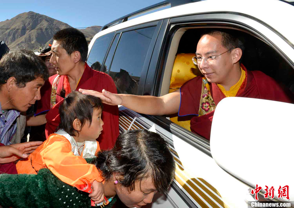 10月10日,活佛车辆途经之地,等待接受活佛摸顶的信众也一一得到了活佛的加持。李林 摄