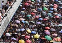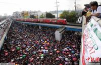 当地时间2013年10月14日,菲律宾马尼拉,数千市民聚集在十字路口领取菲律宾最大的基督教派之一提供的救援物资。大量的人群严重影响了菲律宾数个城市的交通。