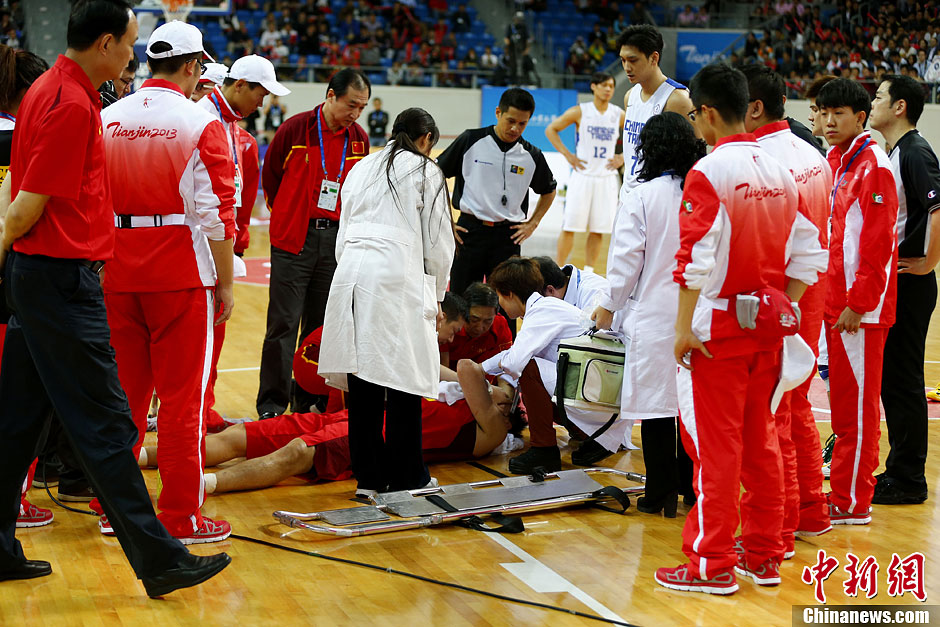 10月14日,东亚运动会男篮决赛在中国(红)与中华台北队(白)之间展开争夺。中华台北男篮在一度落后两位数的情况下,最后时刻逆转,以82-79战胜中国夺冠,中国队屈居亚军。图为中国队孙桐林受伤倒地。中新社发 富田 摄