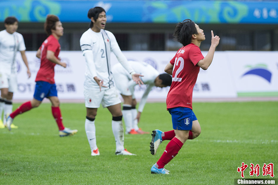 10月14日,韩国队22号金善珉在进球后庆祝。当日,东亚运动会男足最后一轮比赛,中国香港0比6惨败韩国,无缘奖牌。中新社发 崔楠 摄