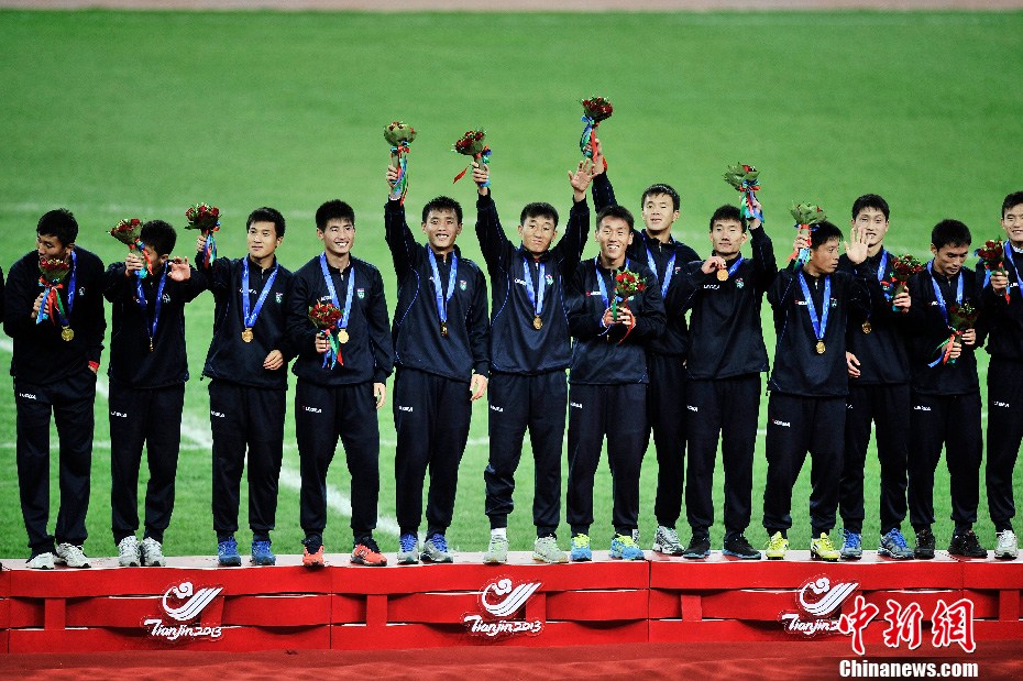 10月14日晚,东亚运动会男足决赛在天津奥体中心体育场进行,最终,中国男足0-3负朝鲜,朝鲜队以3胜1平0负,总积分10分的战绩夺冠。中新社发 佟郁 摄