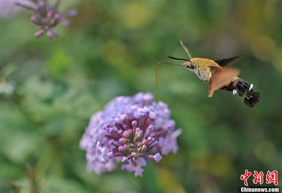 日前,一只蜂鸟蛾现身湖北省宜都市潘家湾土家族乡梁山村,摄影爱好者用镜头拍下了它的各种飞行姿态,很是惹人喜爱。图为蜂鸟蛾在采蜜。曹礼达 摄