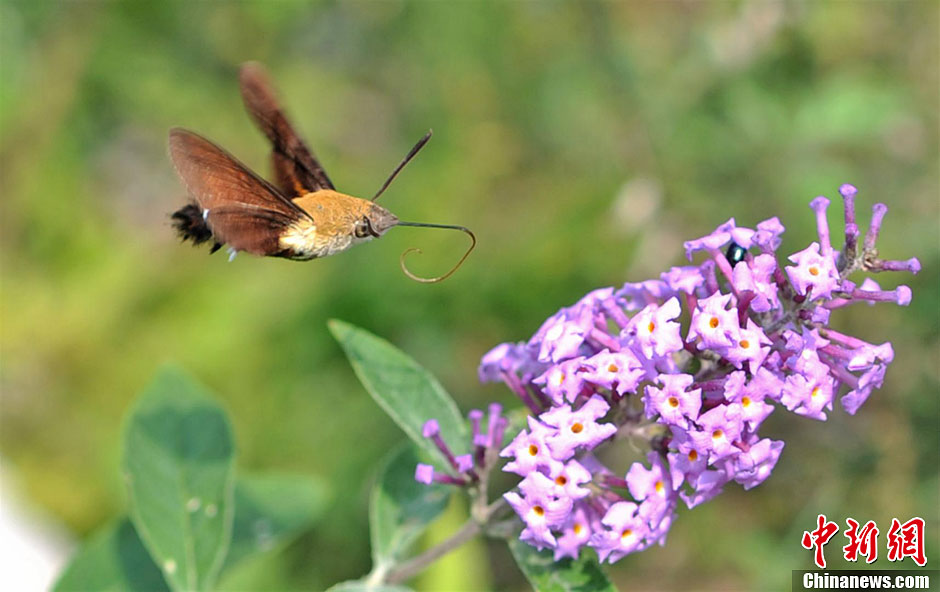 日前,一只蜂鸟蛾现身湖北省宜都市潘家湾土家族乡梁山村,摄影爱好者用镜头拍下了它的各种飞行姿态,很是惹人喜爱。图为蜂鸟蛾穿梭于花丛中。曹礼达 摄