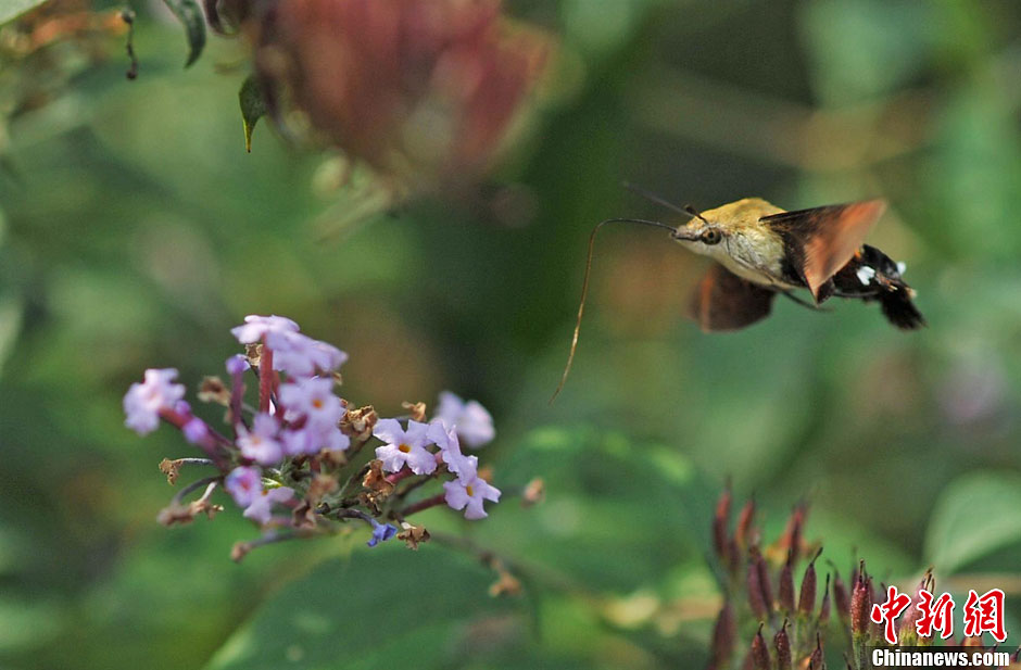 日前,一只蜂鸟蛾现身湖北省宜都市潘家湾土家族乡梁山村,摄影爱好者用镜头拍下了它的各种飞行姿态,很是惹人喜爱。图为蜂鸟蛾穿梭于花丛中。曹礼达 摄