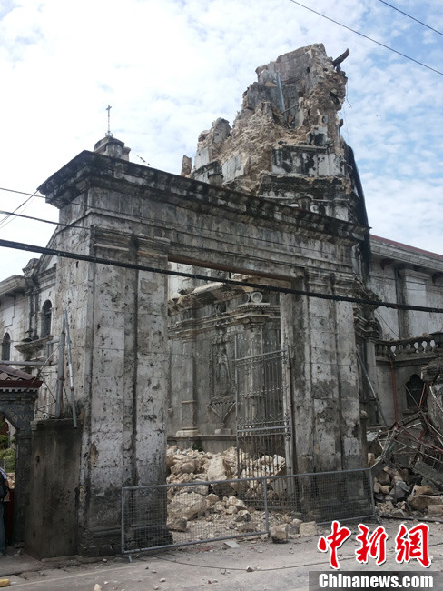 10月15日,菲律宾中部地区发生7.2级地震,灾情持续扩大,菲官方称地震已造成宿务、保和等省份数十人遇难,数百人受伤,大批建筑物受损。图为宿务省省会宿务市知名估计,拥有400多年历史的StoNino教堂在地震中严重受损。中新社发 翁伟汤 摄
