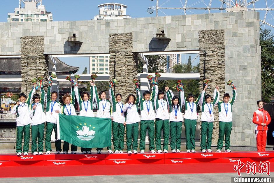 10月15日,第六届东亚运动会龙舟比赛在天津市水上公园举行龙舟-女子500米(12人龙舟)颁奖仪式,中国澳门获铜牌。中新社发 张道正 摄