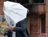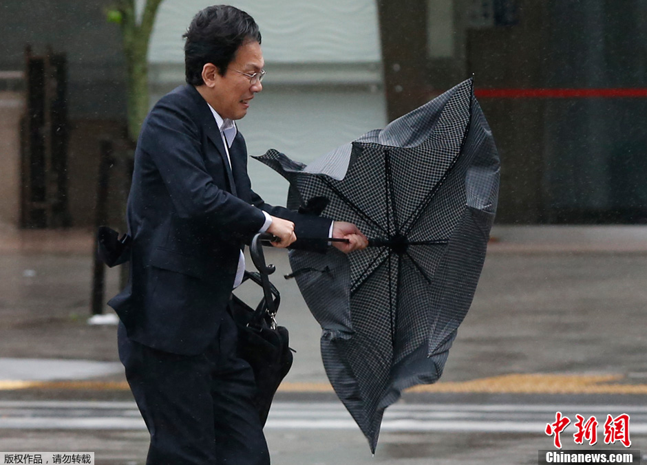 当地时间2013年10月16日,日本东京,行人撑伞艰难行走。据日本气象厅称,强台风“韦帕”正式登陆关东地区。此次台风将是十年来袭击东海道的最强台风。