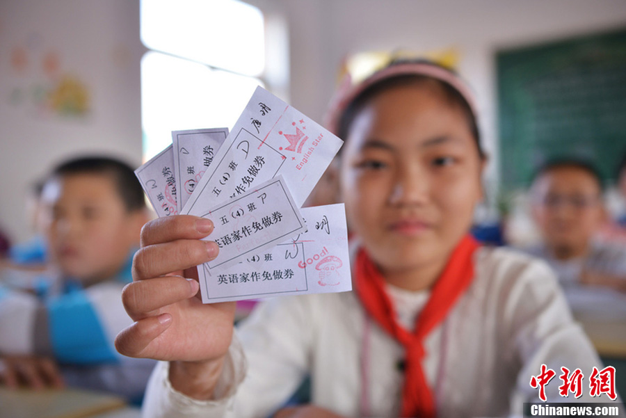 2013年10月16日,江苏镇江新区实验小学五年级(4)班的唐玥在展示她获得的五张“作业免做券”。封疆江 摄 图片来源:东方IC 版权作品 请勿转载