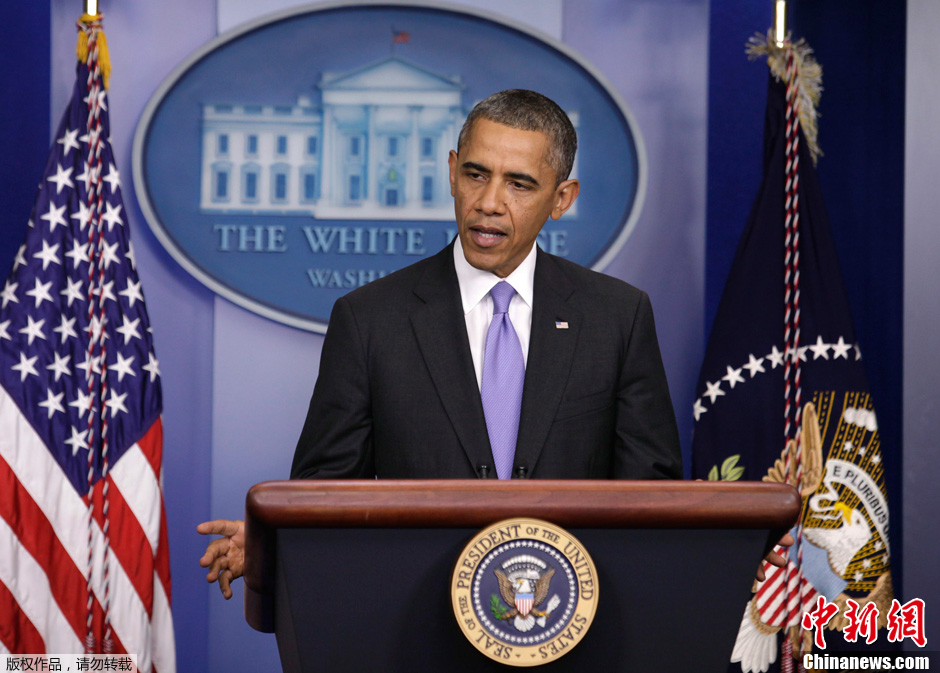 当地时间2013年10月16日,美国华盛顿,美国总统奥巴马在新闻简报会上发言。美国参议院民主和共和两党就延长美国举债期限和结束政府停摆达成一致。这项议案的具体内容包括结束政府停摆、向联邦政府拨款日期延长至2014年1月15日, 同时将举债期限延长至2014年2月7日。