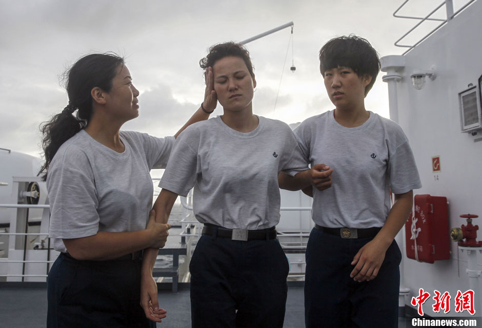 图为7月9日女兵队队长郭红霞和女舰员王超一起安慰晕船的维族姑娘古力。中新社发 张浩 摄