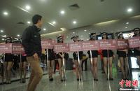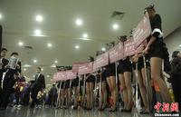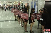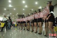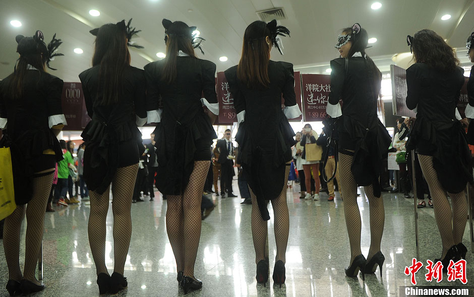 10月17日,重庆房价会上,不少“丝袜美女”举着宣传牌,吸引了不少市民围观。当日,重庆秋季房交会在南坪会展中心正式拉开序幕。图为“丝袜美女”吸引民众围观。陈超 摄