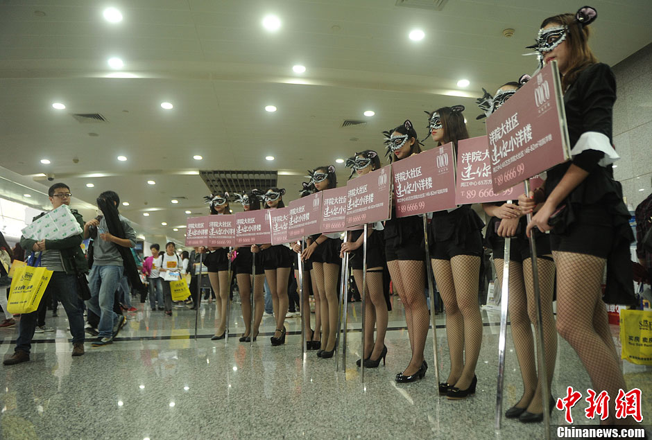 10月17日,重庆房价会上,不少“丝袜美女”举着宣传牌,吸引了不少市民围观。当日,重庆秋季房交会在南坪会展中心正式拉开序幕。图为“丝袜美女”吸引民众围观。陈超 摄
