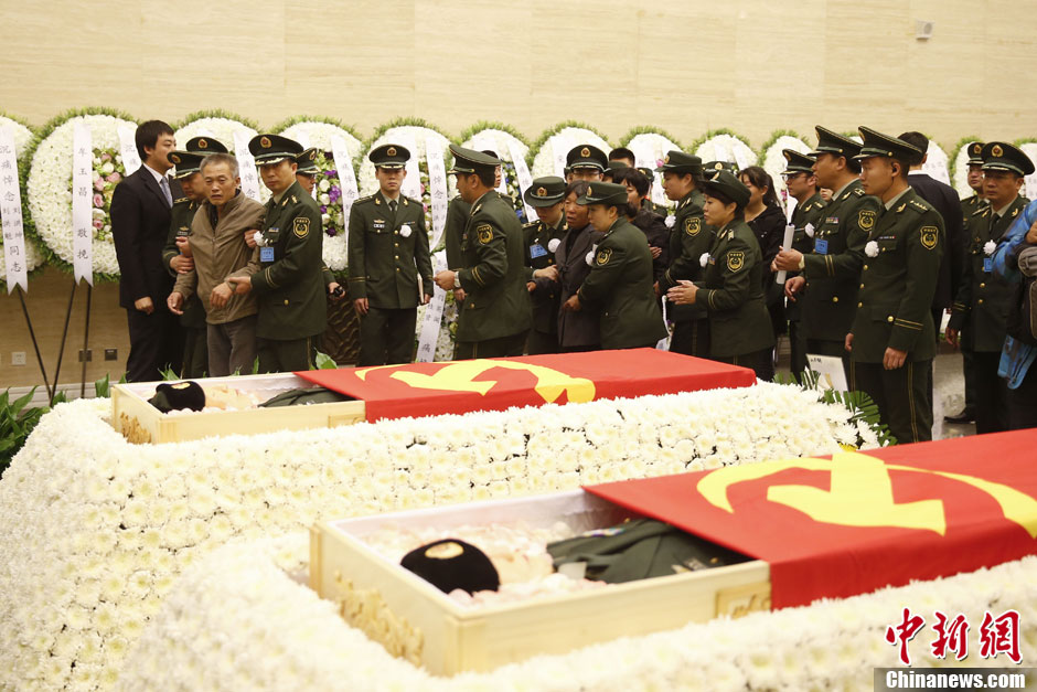 10月17日,刘洪坤、刘洪魁烈士遗体告别仪式在北京八宝山革命公墓礼堂举行。图为两名烈士的家属向遗体告别。中新社发 盛佳鹏 摄