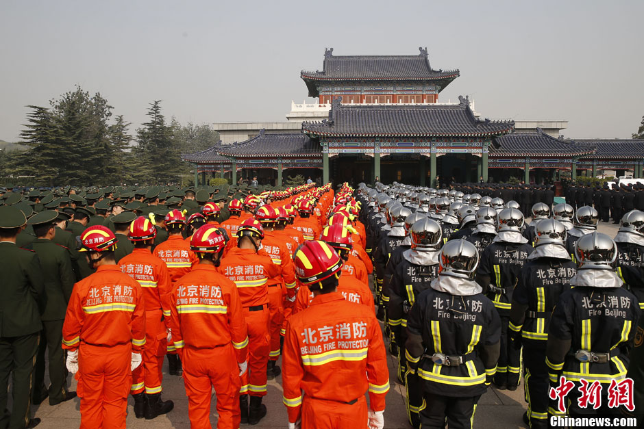 10月17日,刘洪坤、刘洪魁烈士遗体告别仪式在北京八宝山革命公墓礼堂举行,消防官兵集体参加。中新社发 盛佳鹏 摄