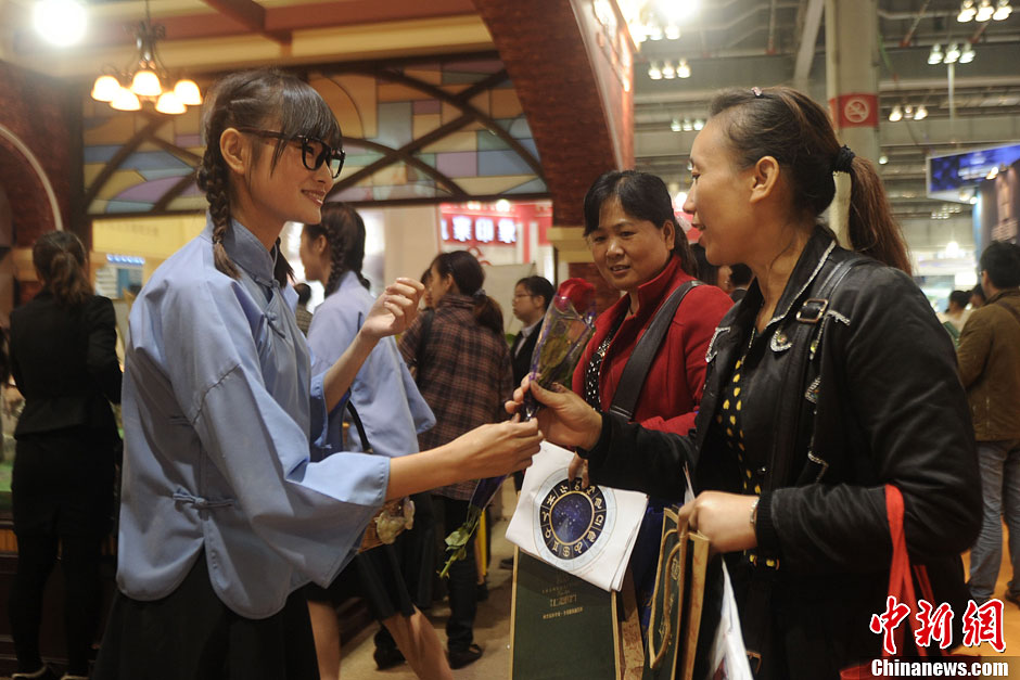 10月17日,重庆秋季房交会上,参展商工作人员穿着比基尼、学生装、保安服等新奇的工作服装吸引顾客前来看房。图为工作人员穿着“学生装”为前来看房市民发放鲜花。中新社发 陈超 摄