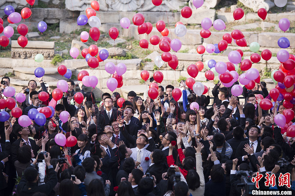 10月17日,参加成人礼的学生放飞气球。当日,来自北京101中学的600名高三学生在圆明园大水法前举行集体成人礼,在即将开始的高考冲刺前,鉴证自己与同学共同的18岁生日。中新社发 崔楠 摄