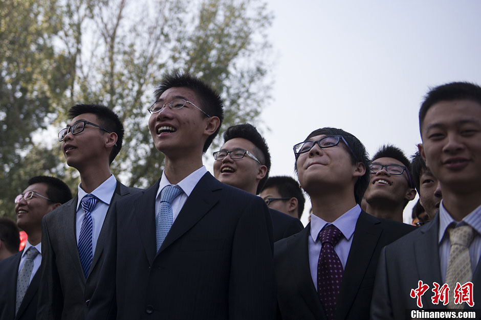 10月17日,西装革履参加成人礼的高三男生。当日,来自北京101中学的600名高三学生在圆明园大水法前举行集体成人礼,在即将开始的高考冲刺前,鉴证自己与同学共同的18岁生日。中新社发 崔楠 摄