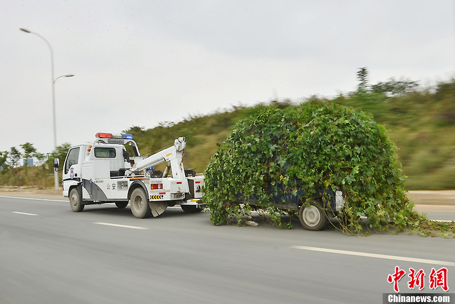 2013年10月17日,四川省成都市,长满藤蔓的面包车被交警拖往事故停车场,吸引过往司机的目光。当日,在双流华阳一小区外停放着一辆长满藤蔓的“僵尸车”,据当地住户介绍,该车牌为川AN497P的蓝色面包车已在此停放了一年多。报警后交警将车拖往交警事故停车场。图片来源:CFP视觉中国