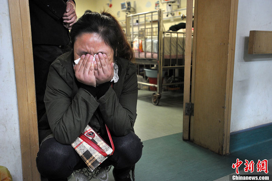 10月17日,武汉,吴秋霞接受第5次手术,由养母为她捐皮。图为亲生母亲在病房外痛哭。曲严 摄 图片来源:CFP视觉中国