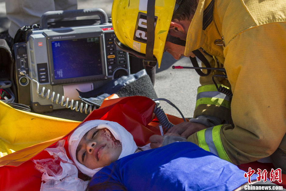 当地时间10月17日,一名消防员为一名模拟受伤的“伤者”救治。当天,在美国加利福尼亚州洛杉矶举行了第六届年度全球最大规模地震演习“大摇晃”(Great ShakeOut)。中新社发 林戈 摄