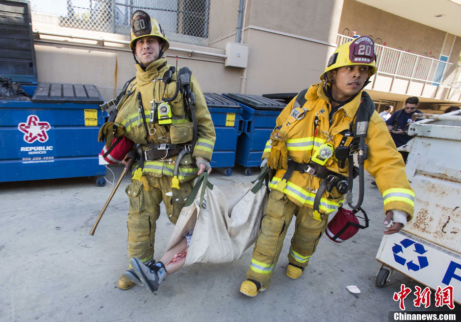 当地时间10月17日,消防员把一名模拟受伤的“伤者”从地震现场救出。当天,在美国加利福尼亚州洛杉矶举行了第六届年度全球最大规模地震演习“大摇晃”(Great ShakeOut)。中新社发 林戈 摄
