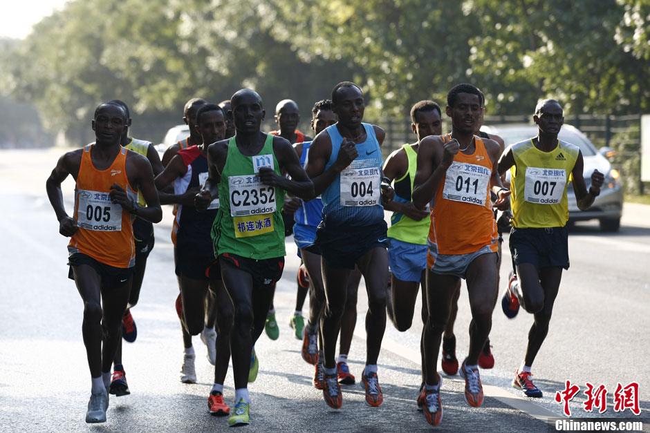 10月20日,2013北京马拉松在北京天安门广场鸣枪起跑。图为领先的第一集团。中新社发 张家瑞 摄