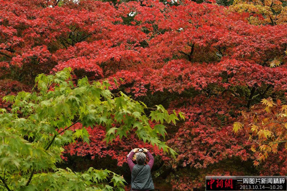 彩叶:当地时间10月17日,英国泰特伯里(Tetbury)附近的韦斯顿伯特植物园(Westonbirt Arboretum)内,一名游客在槭树林间的空地上拍摄多彩的树叶。