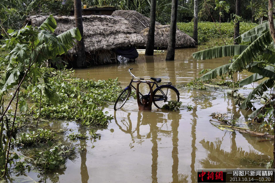 涉水而过:当地时间10月15日,强降水造成印度斋浦尔区的水位上涨,图为一名男子背着自行车涉水而过。