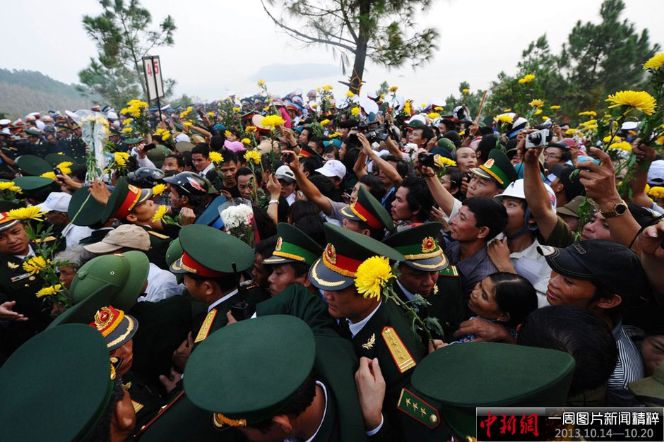 临终送别:当地时间10月13日,越南广平省(Quang Binh Province) Vung Chua为已故大将武元甲(Vo Nguyen Giap)举行安葬仪式,图为吊唁者们试图接近武元甲的坟墓。大量越南民众周日涌进首都,向10月4日去世的武元甲告别。