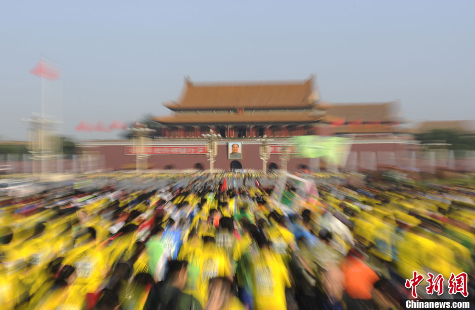 10月20日,2013年北京马拉松在天安门广场鸣枪开跑。参赛选手从天安门广场出发,途经东城、西城和海淀三个行政区,最终完成42公里195米的赛程。中新社发 侯宇 摄
