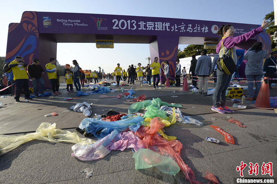 10月20日,2013年北京马拉松在天安门广场鸣枪,大批选手们出发后,在起点处留下大量垃圾。中新社发 侯宇 摄