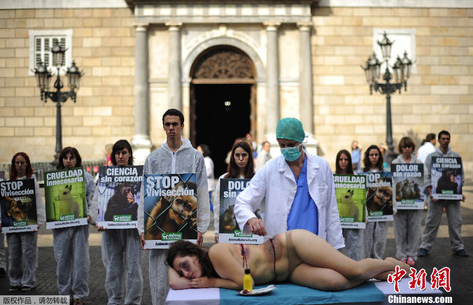 当地时间2013年10月20日,西班牙巴塞罗那,动物保护组织成员示威,呼吁停止活体解剖和动物实验。