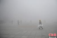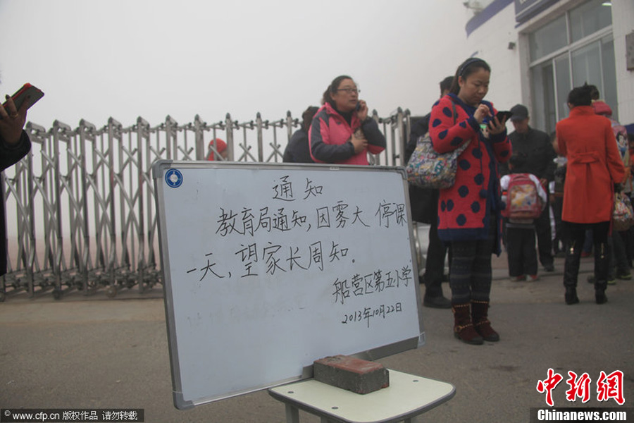10月22日,吉林省吉林市,学校登出停课通知。当日,吉林省吉林市雾霾天气较前一天更重,能见度更低,车辆开灯缓行,中小学停课一天。朱万昌 摄 图片来源:CFP视觉中国