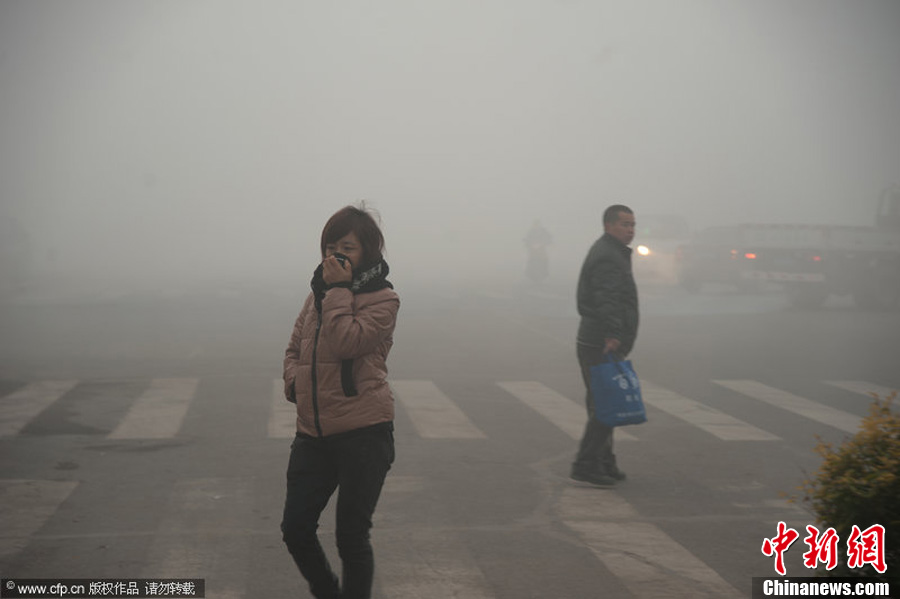 10月22日,吉林省吉林市,市民戴着口罩在雾霾中出行。当日,吉林省吉林市雾霾天气较前一天更重,能见度更低,车辆开灯缓行,中小学停课一天。朱万昌 摄 图片来源:CFP视觉中国