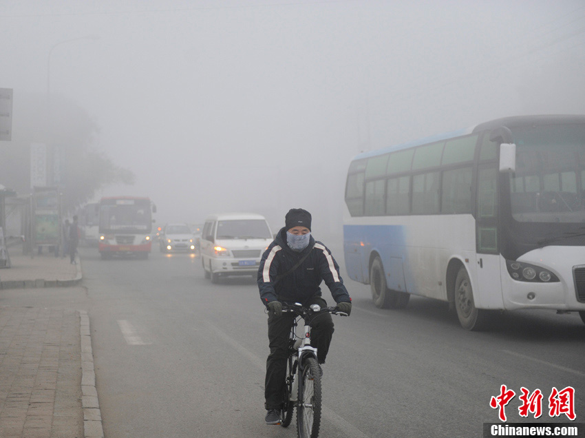 长春雾霾天气升级PM2.5“爆表” 市民掩鼻出行