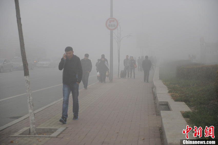 长春雾霾天气升级PM2.5“爆表” 市民掩鼻出行