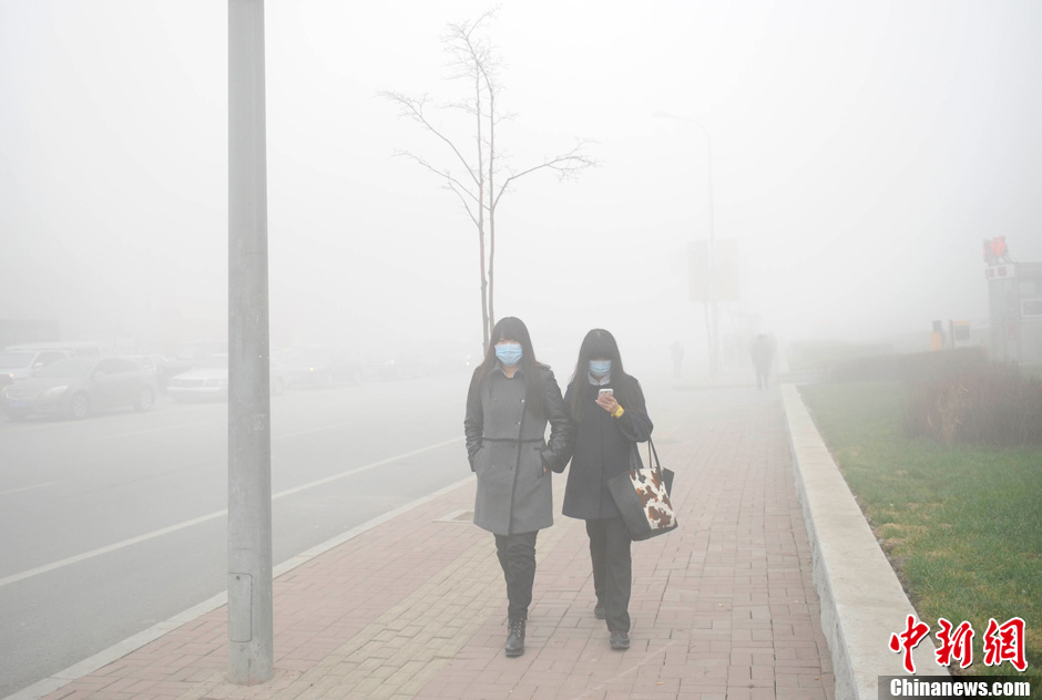 长春雾霾天气升级PM2.5“爆表” 市民掩鼻出行