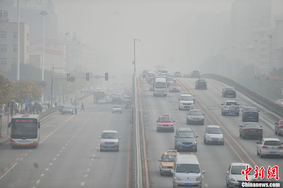 10月22日,大雾笼罩下的辽宁沈阳街头。辽宁从20日开始笼罩在雾霾当中,沈阳等地出现了重度霾天气。气象部门21日晚发布今年首个霾橙色预警信号,并在22日继续发布大雾红色预警。受此影响辽宁境内多半高速公路陷入瘫痪状态,但23日一场降雨降温过程有望驱走雾霾天。中新社发 于海洋 摄