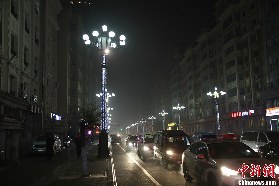 10月22日,哈尔滨持续雾霾天气,白天有所缓解,到了晚上部分地区雾霾又开始加剧。图为哈尔滨市区街道,比21日雾霾有所缓解。中新社发 胡迪 摄