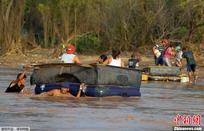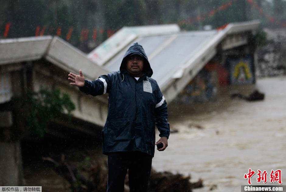 当地时间2013年10月22日,墨西哥Coyuca de Benitez,一名警察在被飓风毁坏的桥梁前指挥交通。受飓风“雷蒙德”影响,墨西哥南部太平洋海岸港口被迫关闭,学校停课,并且有数百人进行疏散。