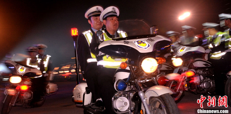 10月23日晚,由河南省公安厅和郑州市公安局两级公安机关参与的“雷霆、打防控”夜巡行动在郑东新区如意湖广场正式启动。图为参加声势浩大“雷霆、打防控”行动的省、市交巡民警出击夜巡。中新社发 刘书亭 摄