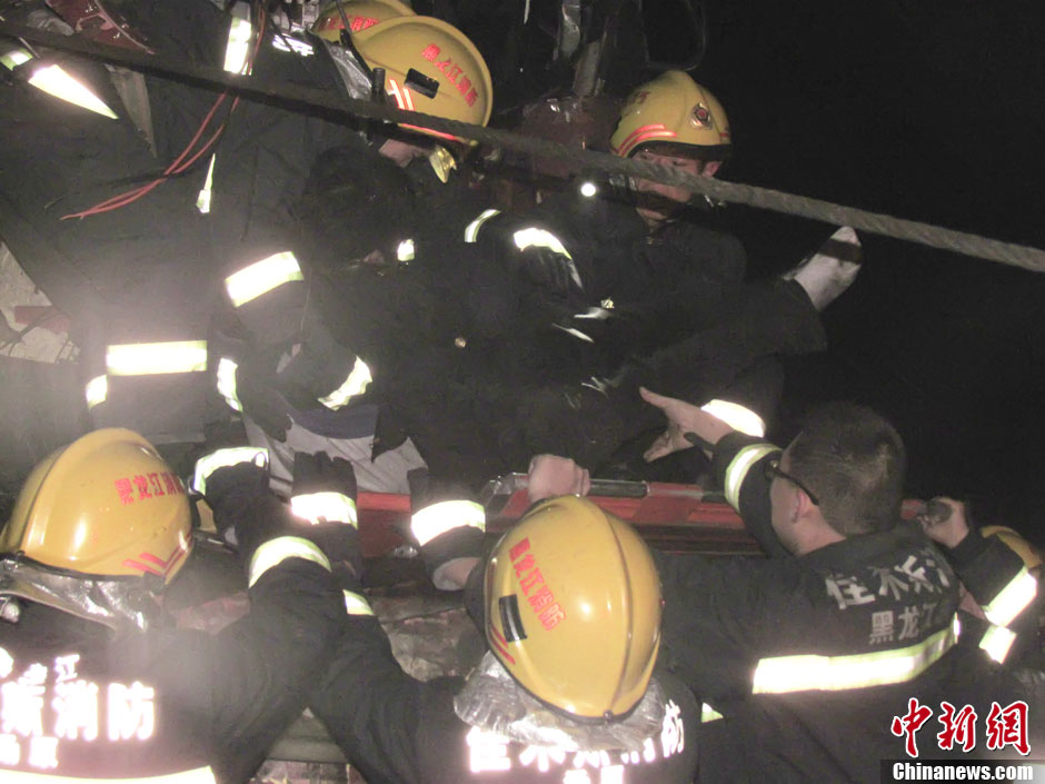 10月24日,经哈尔滨铁路局证实,当日凌晨2时许,黑龙江一旅客列车在途经香兰县境内一铁路口时与一辆拉煤的卡车相撞,事故造成了火车司机当场死亡,有一些旅客受伤,货车司机在相撞时跳车,目前已经被警方控制,事故正在处理中。图为消防队员正在事故发生地进行救援。中新社发 钟欣 摄