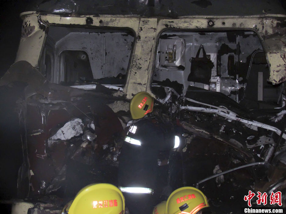 10月24日,经哈尔滨铁路局证实,当日凌晨2时许,黑龙江一旅客列车在途经香兰县境内一铁路口时与一辆拉煤的卡车相撞,事故造成了火车司机当场死亡,有一些旅客受伤,货车司机在相撞时跳车,目前已经被警方控制,事故正在处理中。图为消防队员正在事故发生地进行救援。中新社发 钟欣 摄