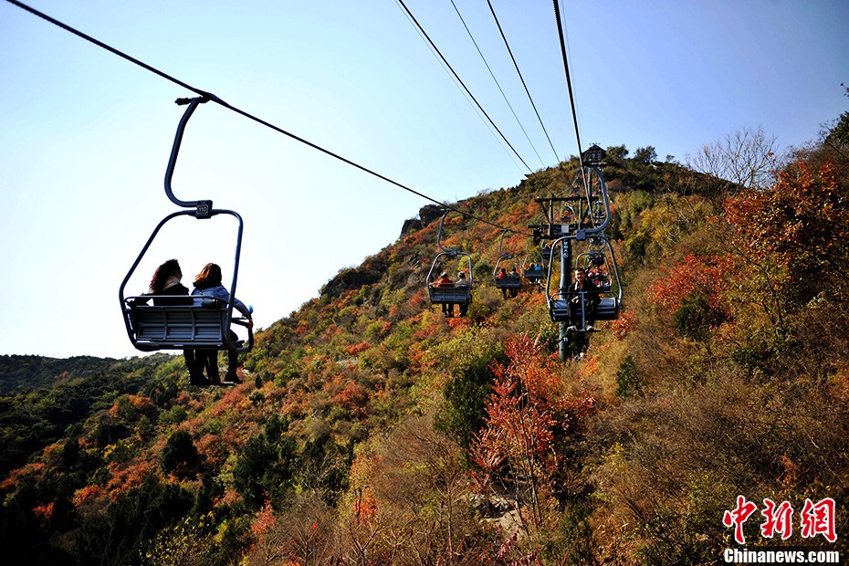 近日,霜降节气的到来,香山红叶也进入了层林尽染、漫山红遍、如火如荼的最佳观赏季节。10月24日,据香山红叶物候观测小组的最新统计数据显示,目前全园红叶的平均变色率达到了60%。香山公园为广大游客推荐:静翠湖、香炉峰、山杏林、看云起亭、森玉笏亭、玉华岫、青未了、隔云钟等8处观看红叶的最佳景点,乘坐索道凌空观赏红叶将成为游客最为热捧的一条游览路线。中新网记者 金硕 摄