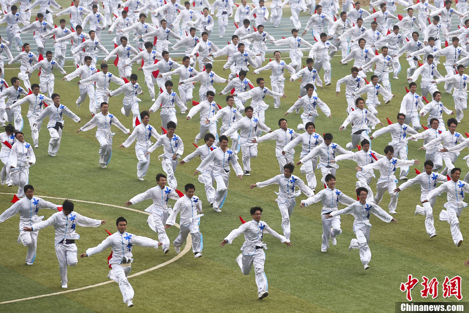 10月24日,南京,大学生们在操场上表演团体操。当日,在中国药科大学江宁校区举办的该校田径运动会开幕式上,来自各个院系的二千余名大学生整齐亮相,在歌曲声中不断变化阵型,场面壮观吸引眼球。中新社发 泱波 摄