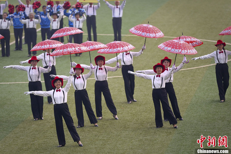 10月24日,退休教师在操场上表演舞蹈。当日,在中国药科大学江宁校区举办的该校田径运动会开幕式上,来自各个院系的二千余名大学生整齐亮相,在歌曲声中不断变化阵型,场面壮观吸引眼球。中新社发 泱波 摄
