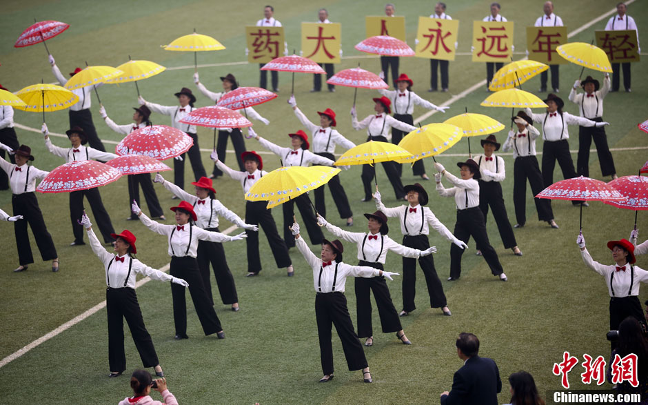 10月24日,退休教师在操场上表演舞蹈。当日,在中国药科大学江宁校区举办的该校田径运动会开幕式上,来自各个院系的二千余名大学生整齐亮相,在歌曲声中不断变化阵型,场面壮观吸引眼球。中新社发 泱波 摄