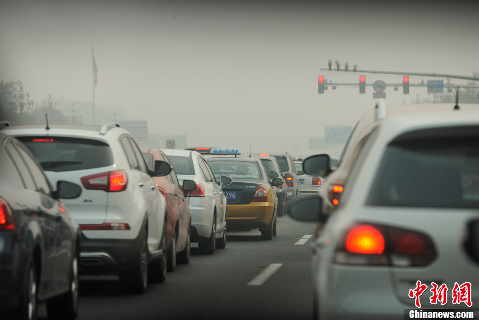 10月28日,北京长安街被雾霾笼罩,能见度不高。今早的北京雾霾弥漫,许多出门的市民都感觉呼吸不舒服。据北京环境监测数据显示,昨天夜间到今天上午,北京北部的昌平、密云、怀柔、延庆等区域空气污染处于5级重度污染,中心城区及南部的房山、大兴、丰台、通州、亦庄等区域处于6级严重污染水平,目前严重的空气污染在今天白天将延续。刘震 摄