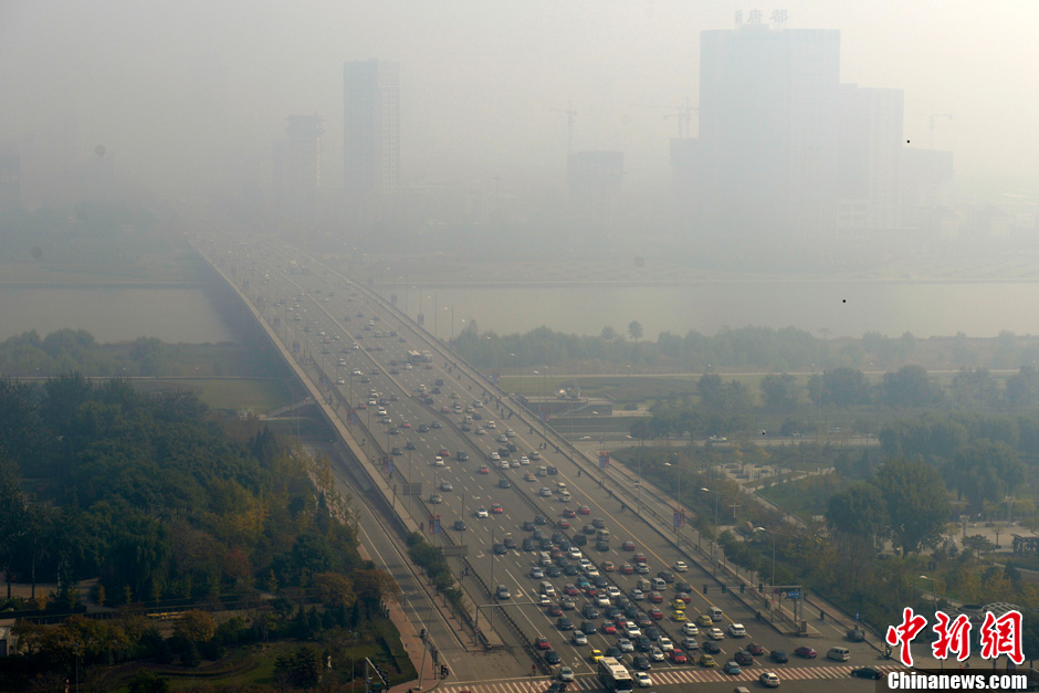 10月28日,山西太原被一片雾霾笼罩。中央气象台当日06时继续发布霾黄色预警,预计,今天白天到夜间,华北中南部空气污染气象条件达4级,局地达5级,很不利于空气中污染物扩散。河北中南部、京津地区、山西南部、陕西关中地区、河南北部、安徽中部、湖北中部、湖南北部等地有中度霾,局地重度霾。韦亮 摄